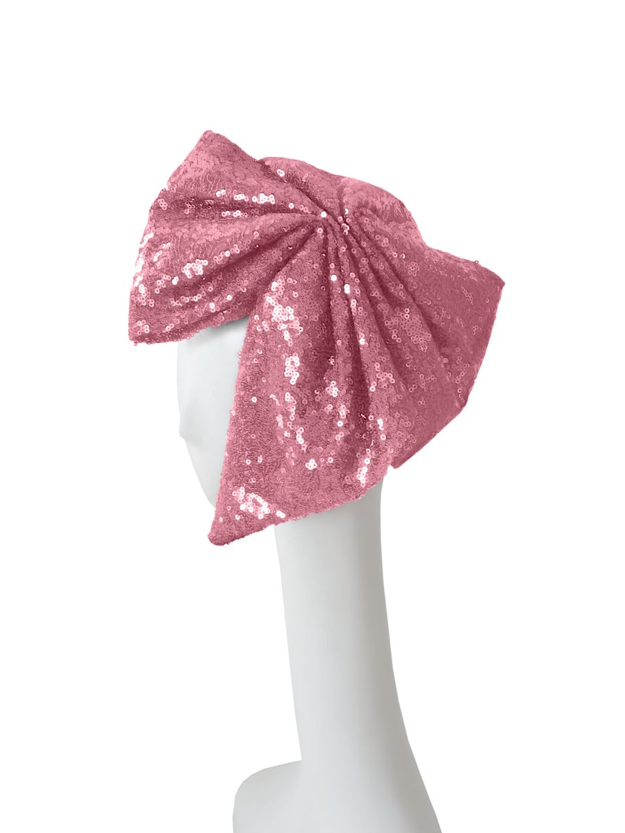 The bow is placed to rest elegantly on one side of the face. Since the sequin material is heavy, we recommend adding pins to the hairstyle if necessary.