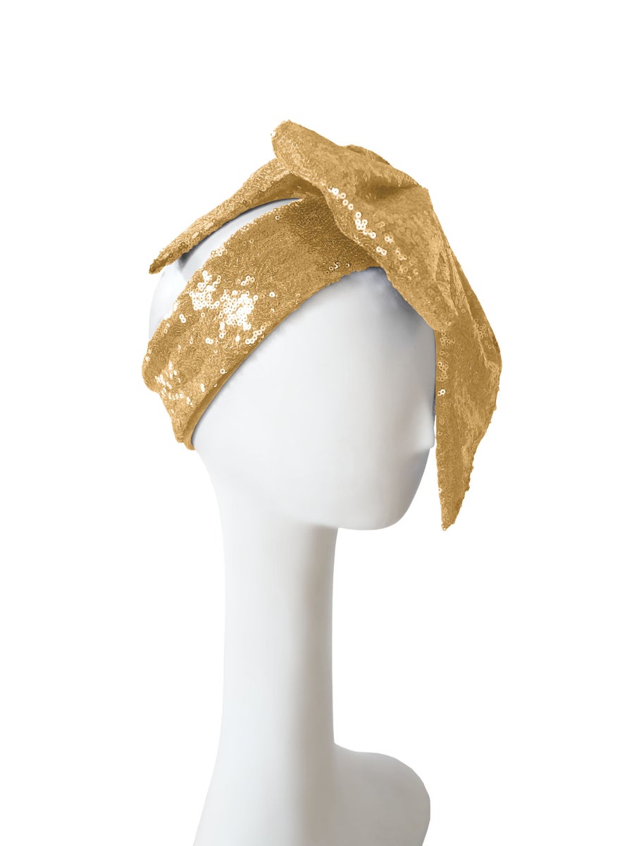 The bow is placed to rest elegantly on one side of the face. Since the sequin material is heavy, we recommend adding pins to the hairstyle if necessary.