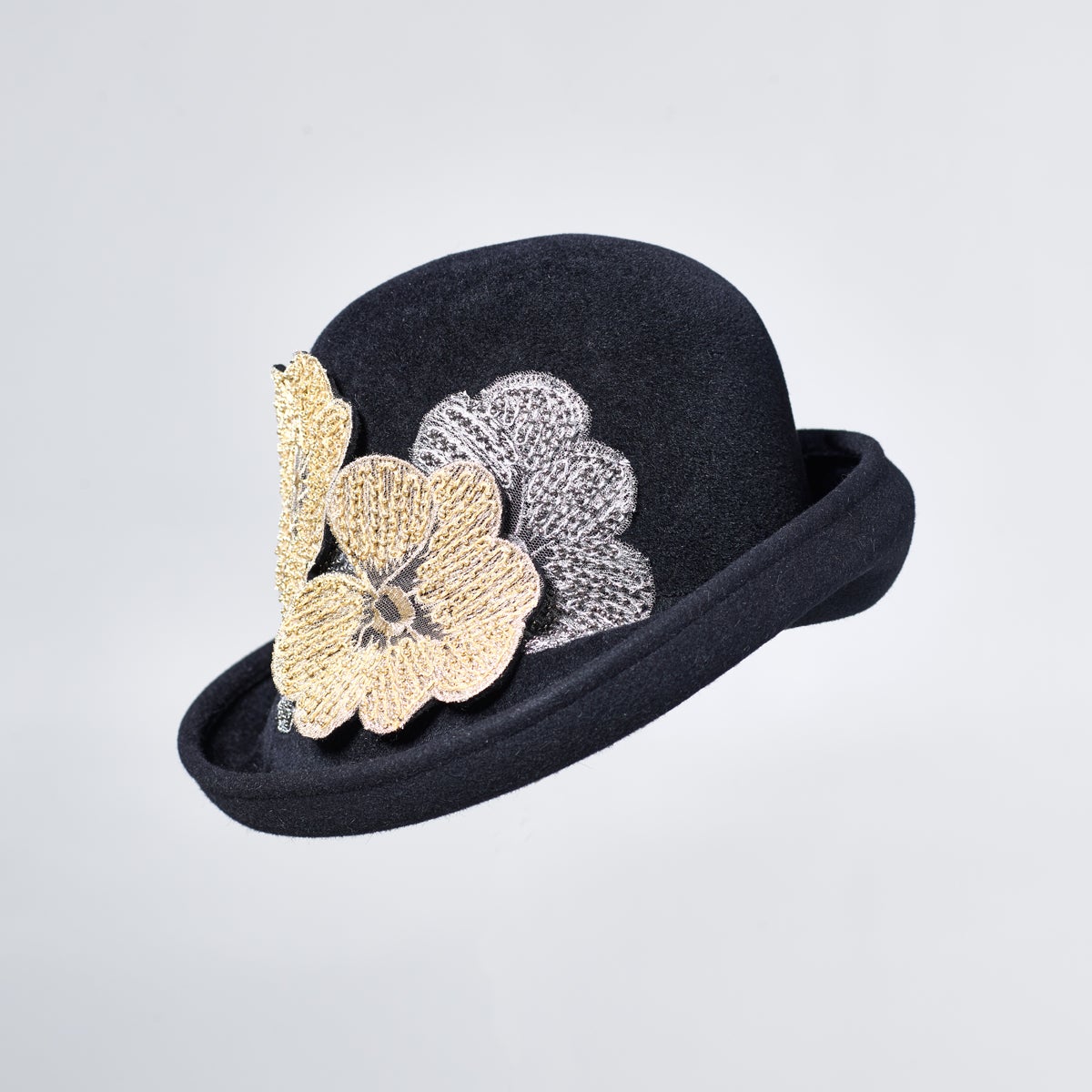 Elegant black cloche hat with beautifully embroidered large flower details by Misa Harada London. This extremely charming clothe could be straight from the Downton Abbey or Hercule Poirot series!
